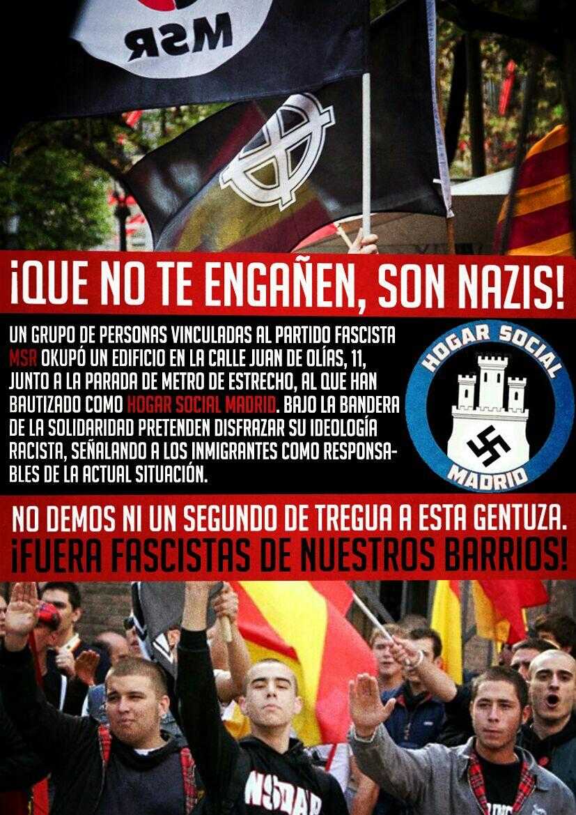La labor cívica y humanitaria de dar ayudas, servicios, constantemente, de forma efectiva, ... la lleva dando el movimiento Okupa en Madrid décadas antes del 15M la P.A.H.... y que ahora LOS NAZIS OS QUERAÍS SUBIR AL CARRO DE LOS ANTISISTEMA... "Patriotas" "social" "Nacional" "Identitarios" "Solidaristas"...y demás chapitas que os ponéis NR, NA, NazBol, ... DA RISA, por no decir vergúenza ajena, vuestra legitimidad está en las cloacas de la ideología, solo a flote a través del recorta y pega, la imitación, el camuflaje y el CONFUSIONISMO.